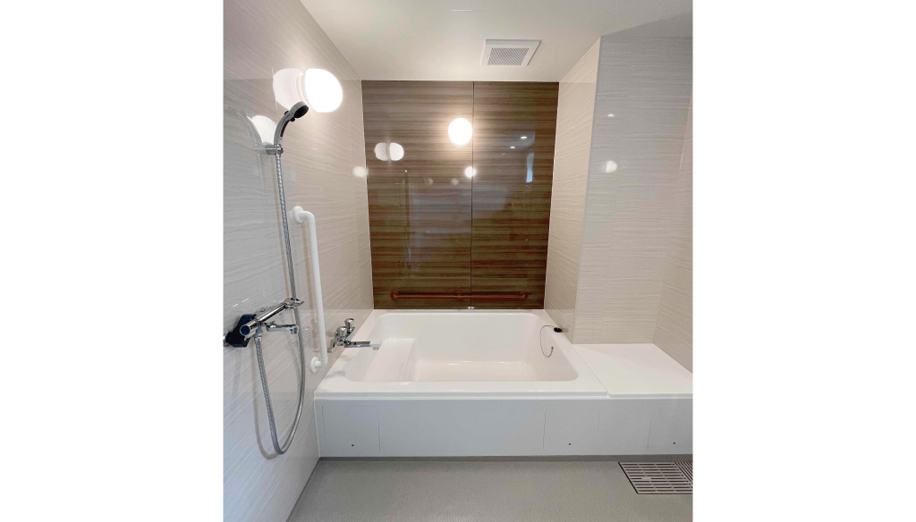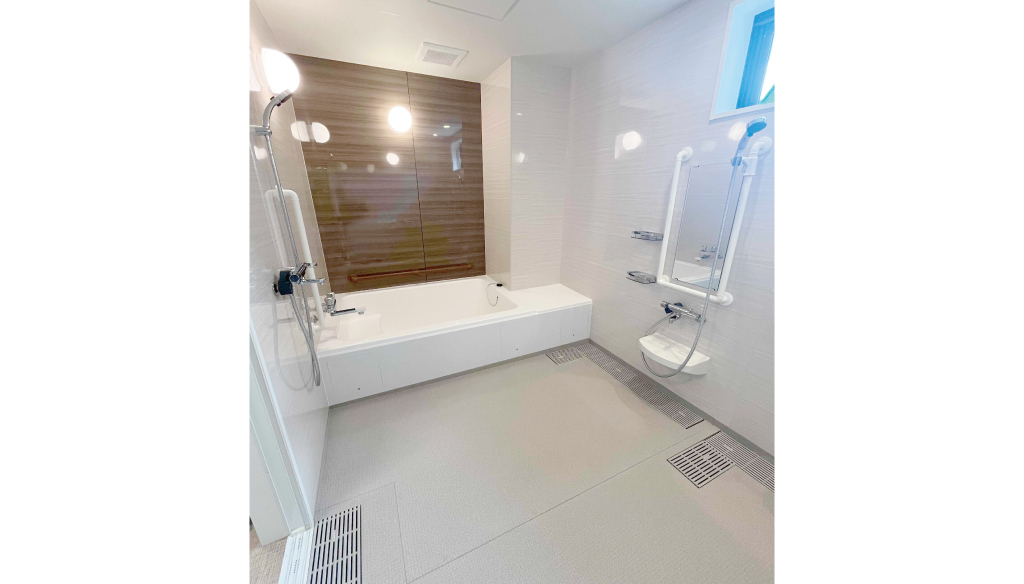 また、浴槽デッキカウンター部分を柱欠きに合わせて設置するなど、現場条件に対応した柔軟な設計を実現。「どこでも手すり」を随所に配置し、利用者の安全性にも配慮しています。