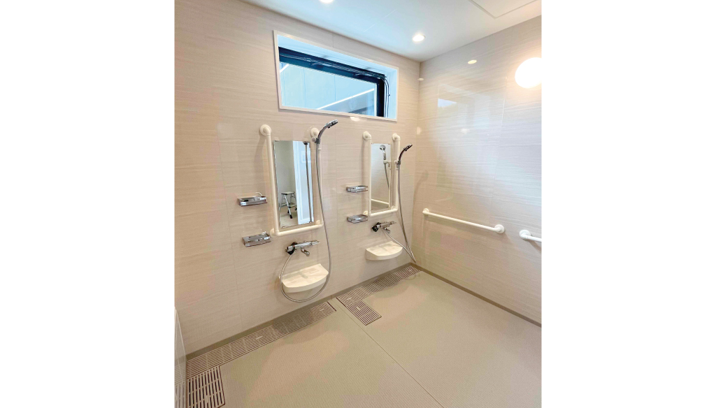 洗い場を2ヶ所に加え、立ちシャワーを利用できるスペースも確保しました。壁面には光沢感のあるハイグレードパネルを採用し、アクセントパネルを組み合わせることで清潔感と落ち着きのある雰囲気を演出。天井高を通常より高めの2.4mとし、開放感のある浴室空間を実現しています。