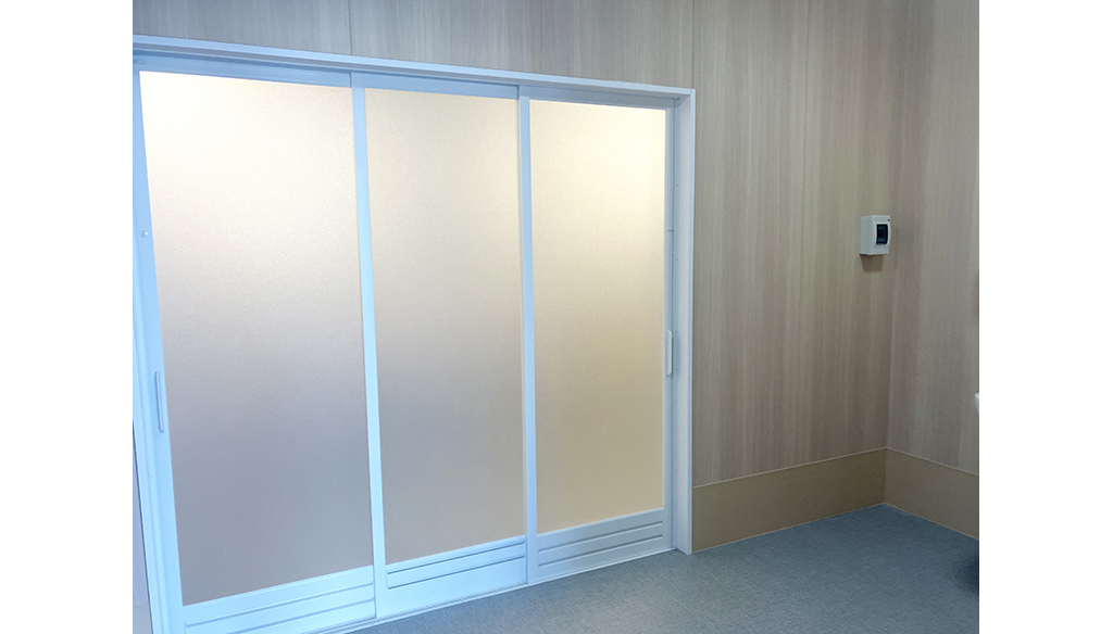 浴槽まわりに十分な介助スペースを確保し、出入口は両開きタイプの3枚引き戸とすることで、ストレッチャーの搬送もスムーズに行えます。壁面はスタンダードパネルを採用し、明るく清潔感のある浴室空間に仕上げました。