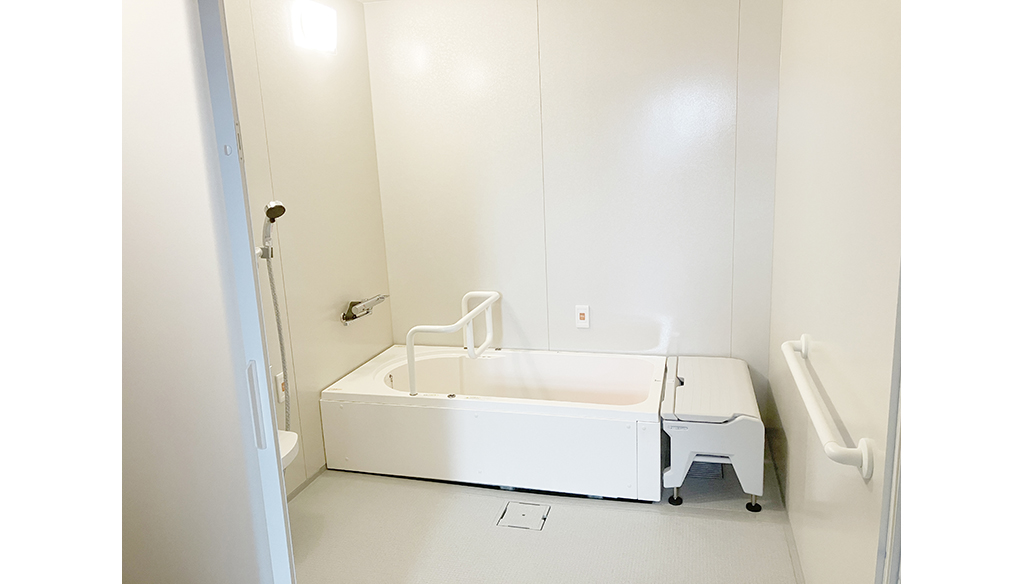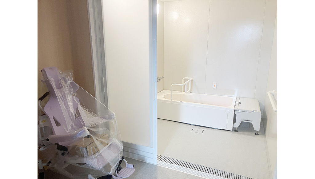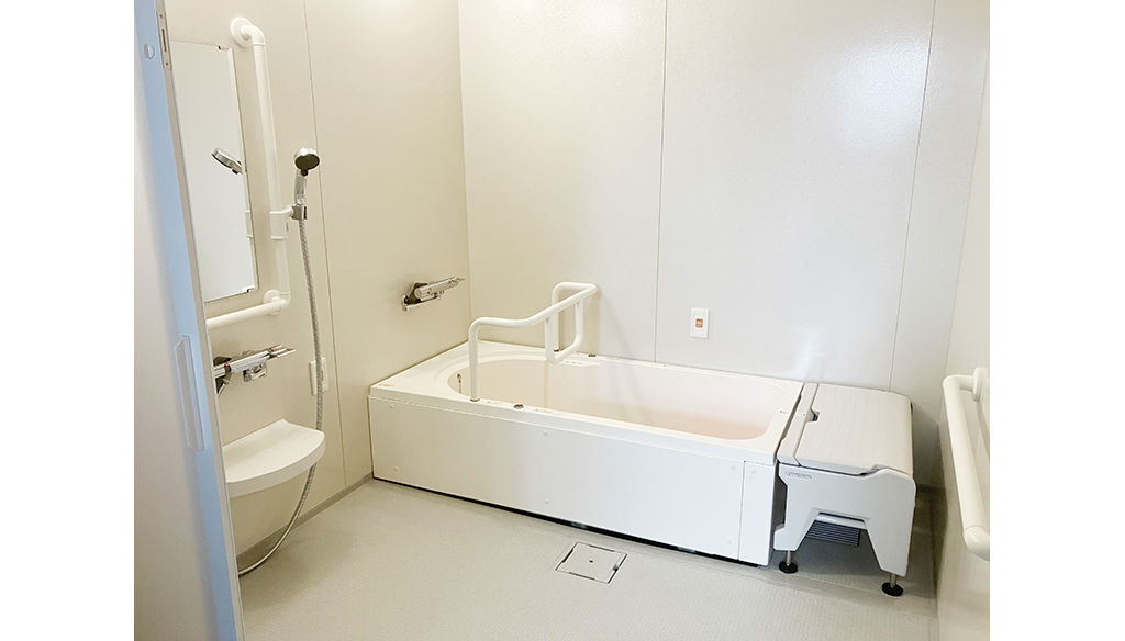 両開きタイプの3枚引き戸を採用することで、機器搬入や介助動線を妨げずに出入りが可能です。リフトを組み合わせることで、移乗から洗身・入浴までを一連の動きで行うことができます。
