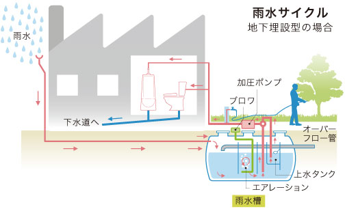 オーダーの大型雨水槽設置による節水は環境貢献につながります。また、集中豪雨などの大型災害時には一時的な治水対策ができるため地域貢献にもつながります。